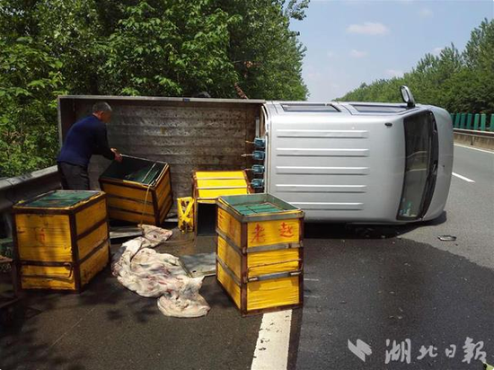 湖北日报讯(记者黄璐、通讯员徐文汇)5月8号上午10点许,一辆轻型货车在湖北省汉宜高速仙桃毛嘴段999公里处发生侧翻事故,车上装载的200斤鲜河虾,受损严重。