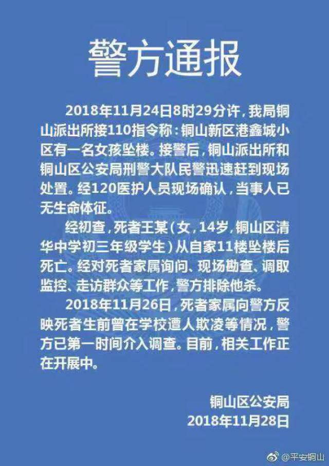 2018 年 11 月 26 日,死者家属向警方反映死者生前曾在学校遭人欺凌等情况,警方第一时间介入调查。目前,相关工作正在开展中。 铜山区教育局也发布通报:2018 年 11 月 24 日(周六),铜山区清华中学一初三学生在家中不幸坠楼。目前公安机关正在调查;区教育局高度重视,已成立联合调查组进驻学校,开展全面深入调查,相关情况将及时予以通报。 " 流言蜚语真的可以害死人,压力真的可以压的人喘不过气来。" 现代快报记者从知情人处获悉,坠楼女生给父母留了一封遗书,平常用的读写笔记亦有流露轻生念头的文字。据悉,该女生成绩不错,全年级排名在 200 名左右。