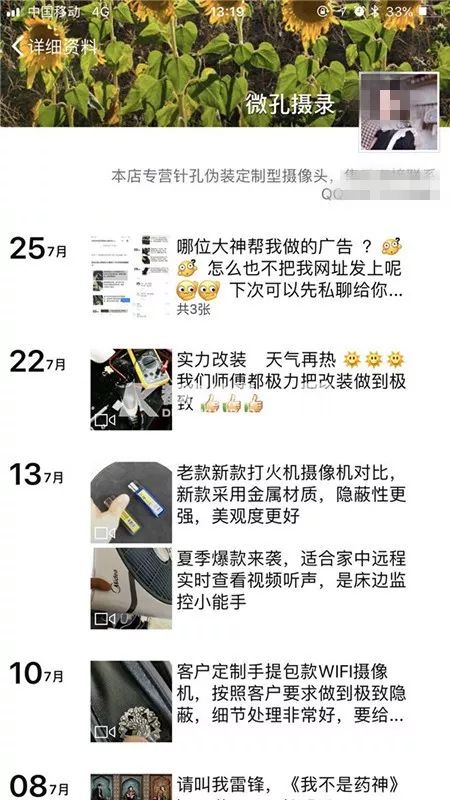 根据该读者提供的信息,我们以顾客的名义找到了这家名叫“微孔摄录”的微店,果然在这个微信号的朋友圈里,经常会更新各类隐蔽针孔偷拍设备的信息,叫卖着伪装成各种产品的针孔摄像头。